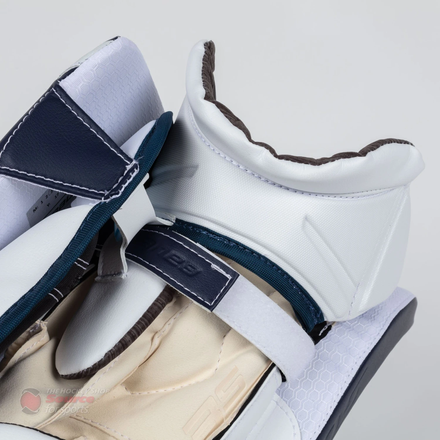 The Bauer Supreme 3S SR blocker is available in all White, White/Black, White/Navy, White/Blue, and White/Red. The 3S Goalie Blocker is available in Regular hand (worn on your right hand) in all colourways, and Full Right (worn on your left hand) in All White.