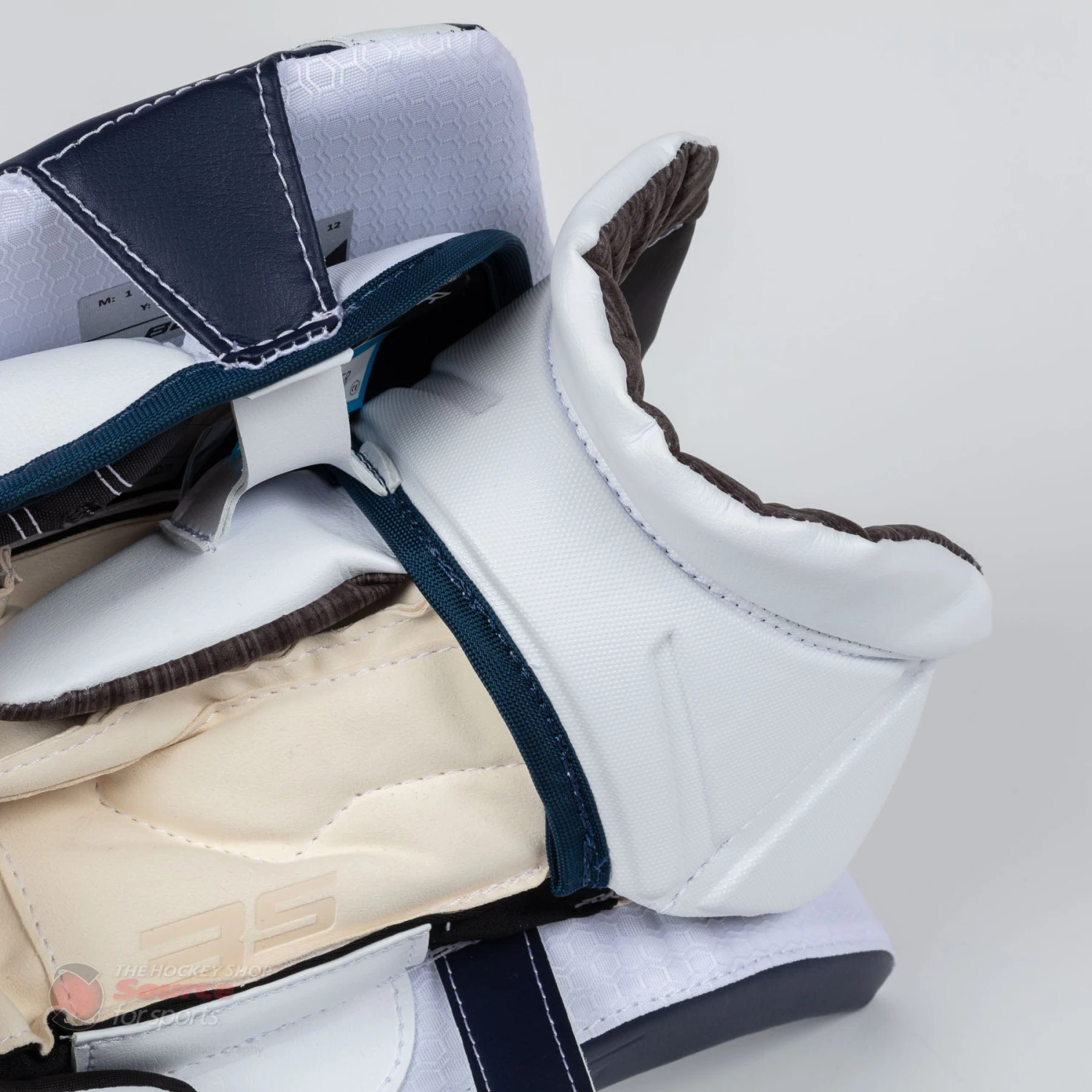 The shape of the blocker is going to be extremely familiar to those who have used a Supreme blocker recently. The side hand shape and protection is brought along from the 2S Pro, providing protection with Bauer’s Shocklite materials. Stock with Bauer’s Ultrasonic blocker there is no thumb pillow, but can be added in when going the custom route.