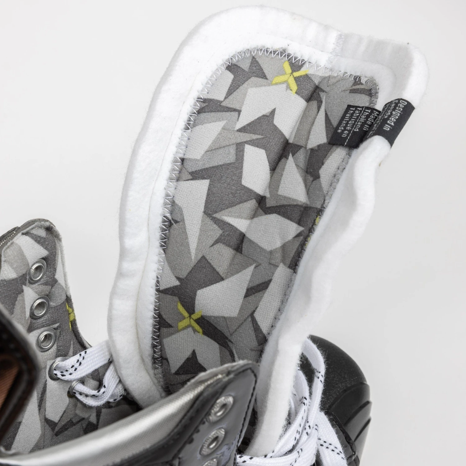 The skate utilizes traditional eyelets for a familiar and reliable lacing system that allows for easy adjustments and a secure fit.