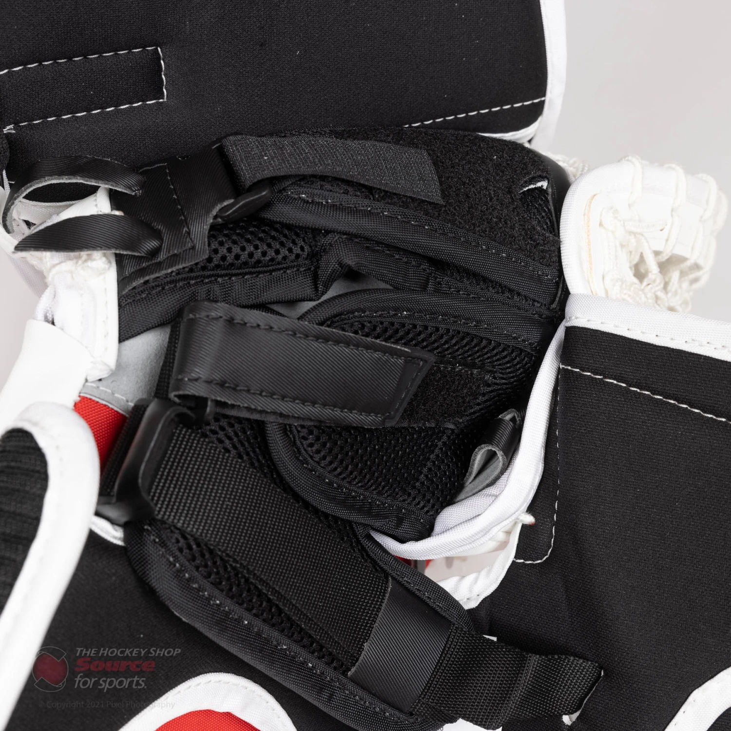 The back hand of the CCM EFlex 5 Trapper features velcro adjustments for the fingers, as well as the back of the hand. Goalies can also customize their fit by the quick release webbing strap on the wrist, which allows for easy and secure adjustment.