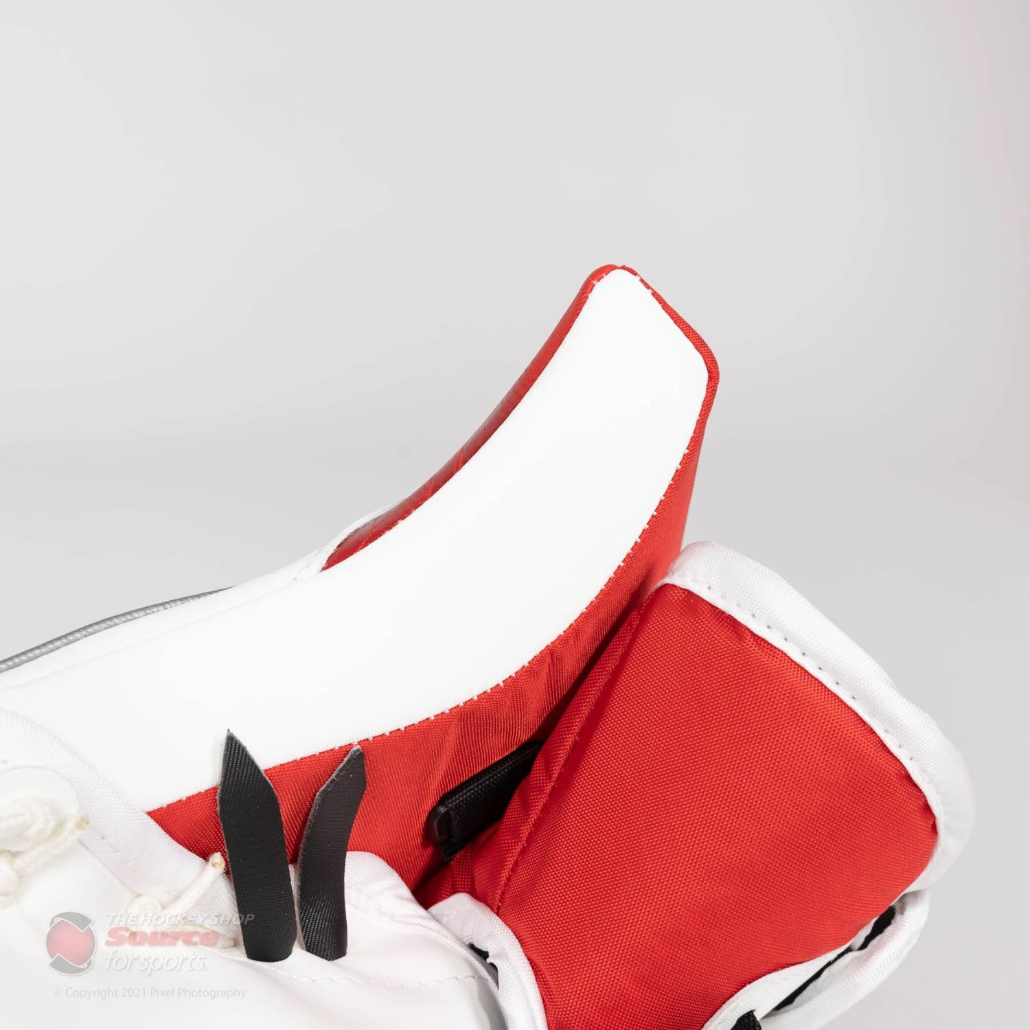 The EFlex 5 Catcher is wrapped in CCM’s proprietary SpeedSkin material. SpeedSkin on a blocker doesn’t have the same slide benefit as it does on pads. However, it is a lighter material than traditional Jenpro, and keeps the material consistent throughout a goalie’s entire setup.
