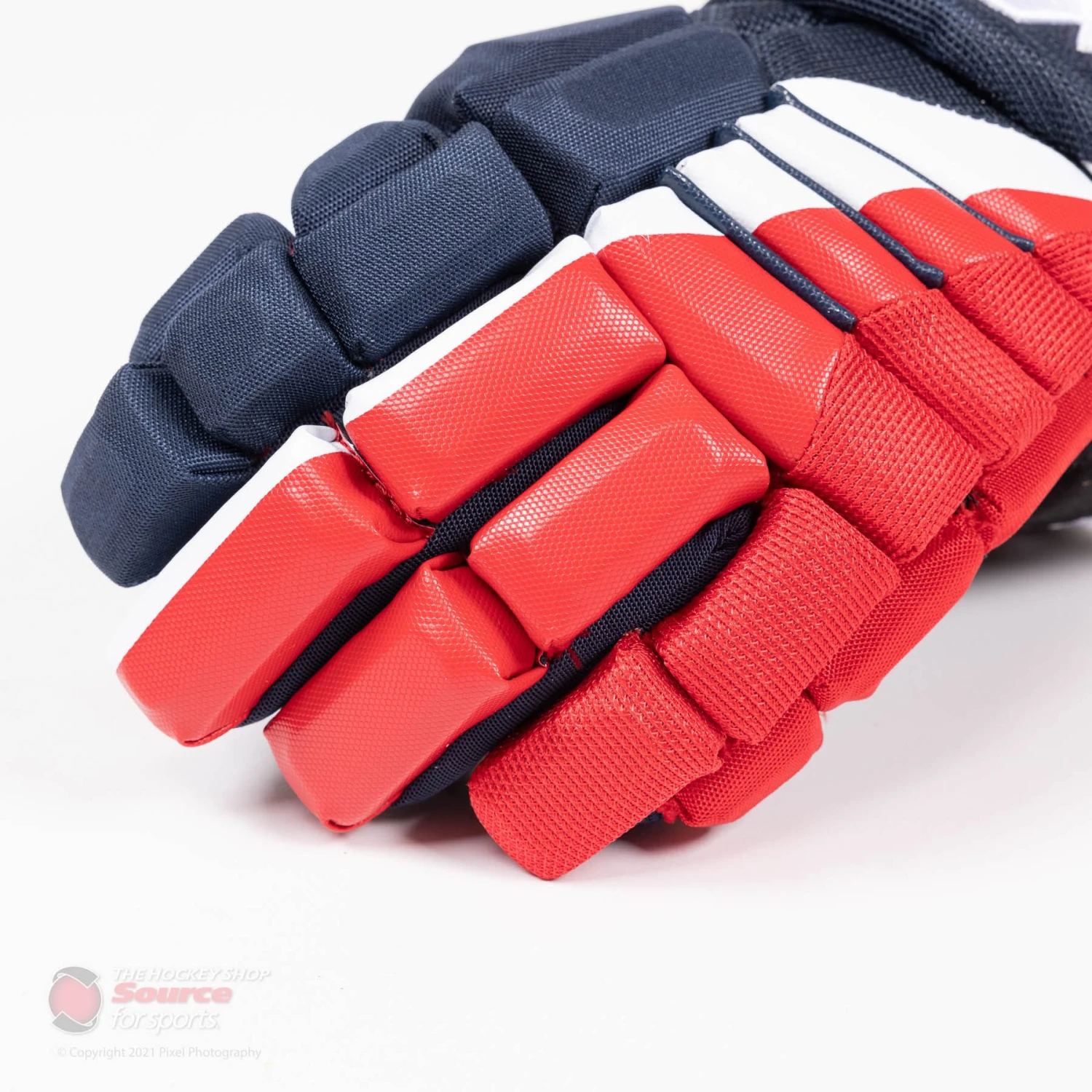 The CCM Jetspeed FT4 Pro Senior Hockey Gloves come in a variety of colours and sizes. The senior sizes are 13”, 14” and 15”, each with the colour options of Black/White, Navy/White, Black/Red/White, Navy/Red/White, or Red.