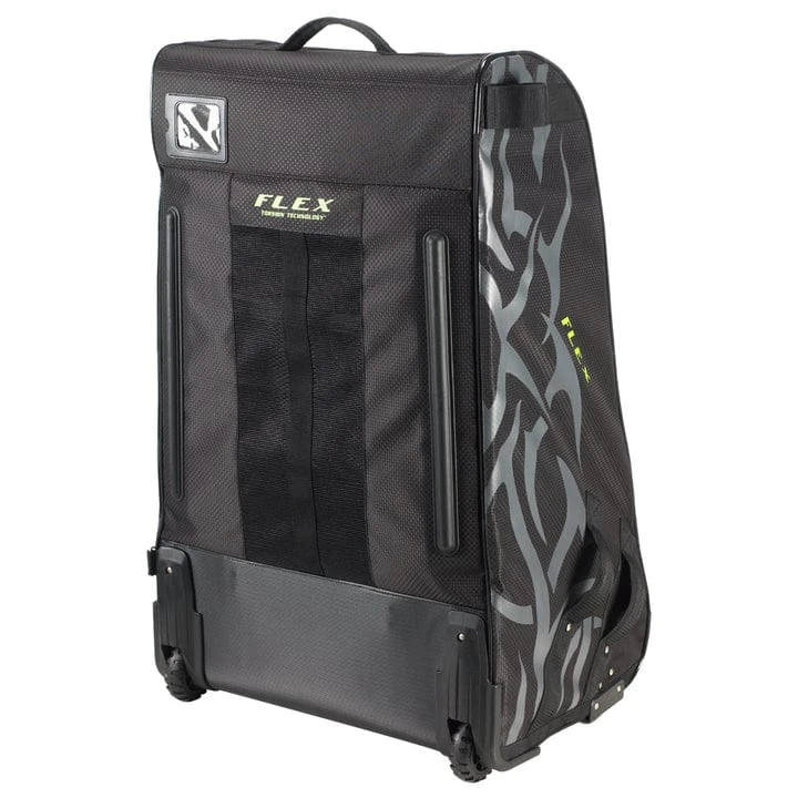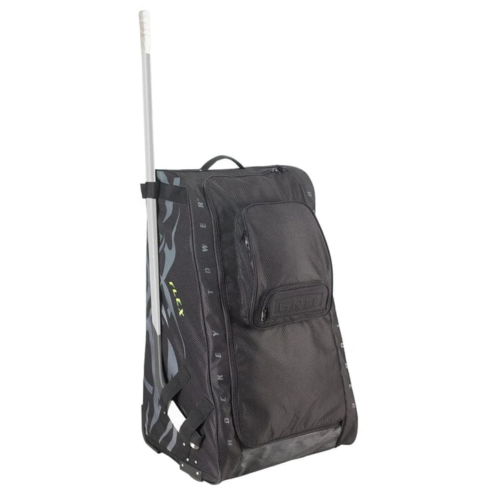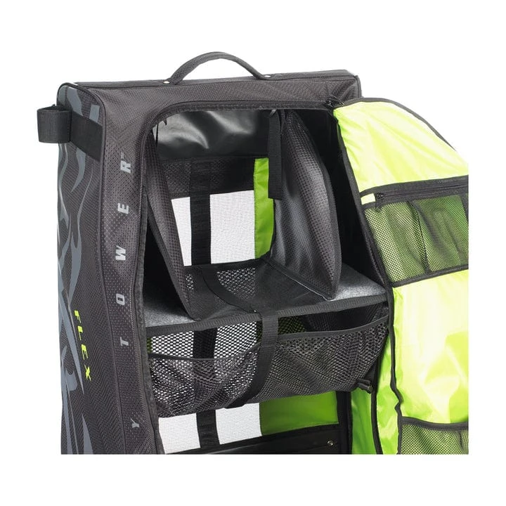 Developed over a period of almost 10 years the FLEX is our sixth generation of Hockey Tower bags. Improvements made to this bag include: a padded shoulder strap which allows the bag to be carried comfortably, a composite frame which reduces the bag weight by almost four pounds and allows flexibility, better ventilation, improved shelving system for quicker air drying and high-vis lining. The bag also folds up instantly for storing beneath the bench during games. Available in – 33″ and 36 inch”.