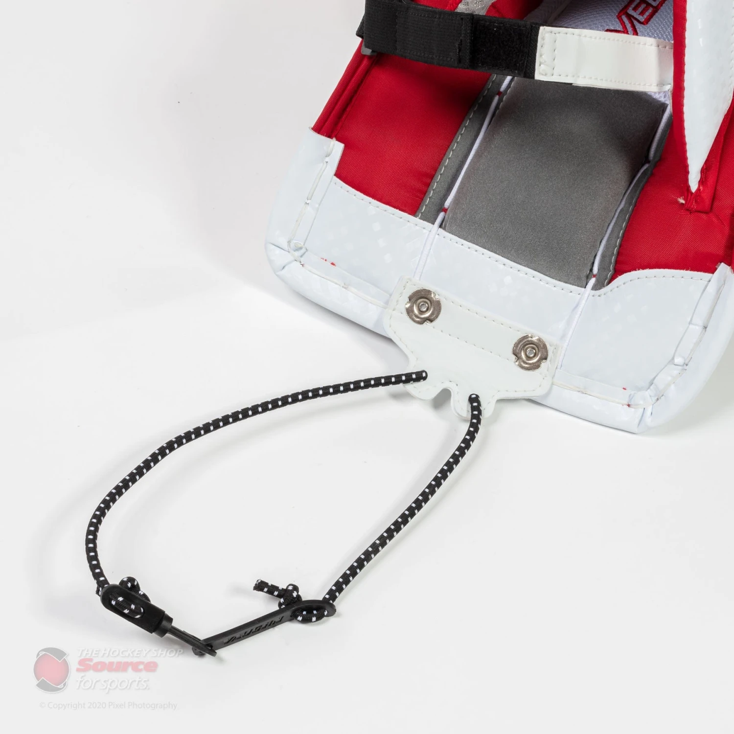 The V9 Jr features a redesigned strapping system and calf wrap allowing for a simpler, quicker and lighter system. Vaughn uses a velcro Reactive Rotation Control strap that sits on the upper calf to allow for quicker yet more controlled pad rotation while giving the pad a connected feel. The calf wrap uses a single velcro strap to seal its extended wings that offer better coverage over those of the VE8 shut. While still a fairly tight fitting leg channel, the V9 Jr has a widened inner leg cradle overall when compared to previous Velocity pads giving goals the feel of a tight fitting leg channel while offering the better rotation associated with a looser leg channel. Finally, the V9 Jr features a velcro bootstrap as well as the same bungee toe tie system seen on the SLR2 leg pads.