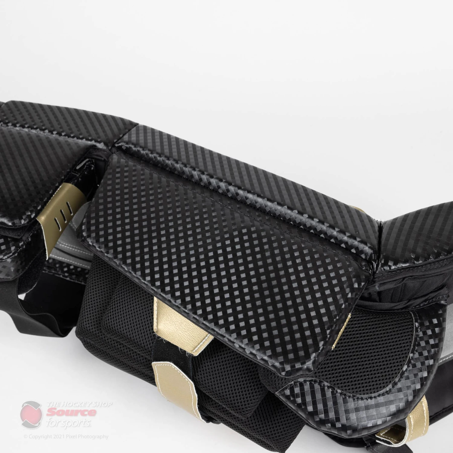 A lower profile, single break outer roll provides good flexibility while further reducing the weight of the V9 Pro Carbon pad. The squared off upper thigh provides better seal and coverage compared to previous Velocity pads and other softer pads. Finally, as the name implies, the V9 Pro Carbon utilizes layers of Vaughn’s new Pure Carbon running tip to toe on top of their sturdy pro core allowing it to maintain its shape while still providing the familiar Vaughn cushion that they have become famous for.